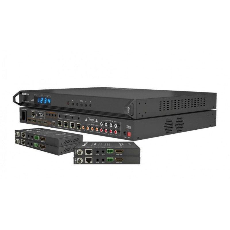 Комплект матричного коммутатора AV-сигналов и набора HDBaseT приемников. Комплект работает по технологии HDBaseT Class B – передача сигналов 4K HDR 10-bit HDCP 2.2 видео, многоканальное аудио, двунаправленный ИК, а так же питание включенных в комплект приемников сигнала от коммутатора. Встроенные в матричный коммутатор де-эмбеддеры аудио, первый выход HDBaseT дублирован выходом HDMI. Принцип plug-and-play для системы коммутации AV.