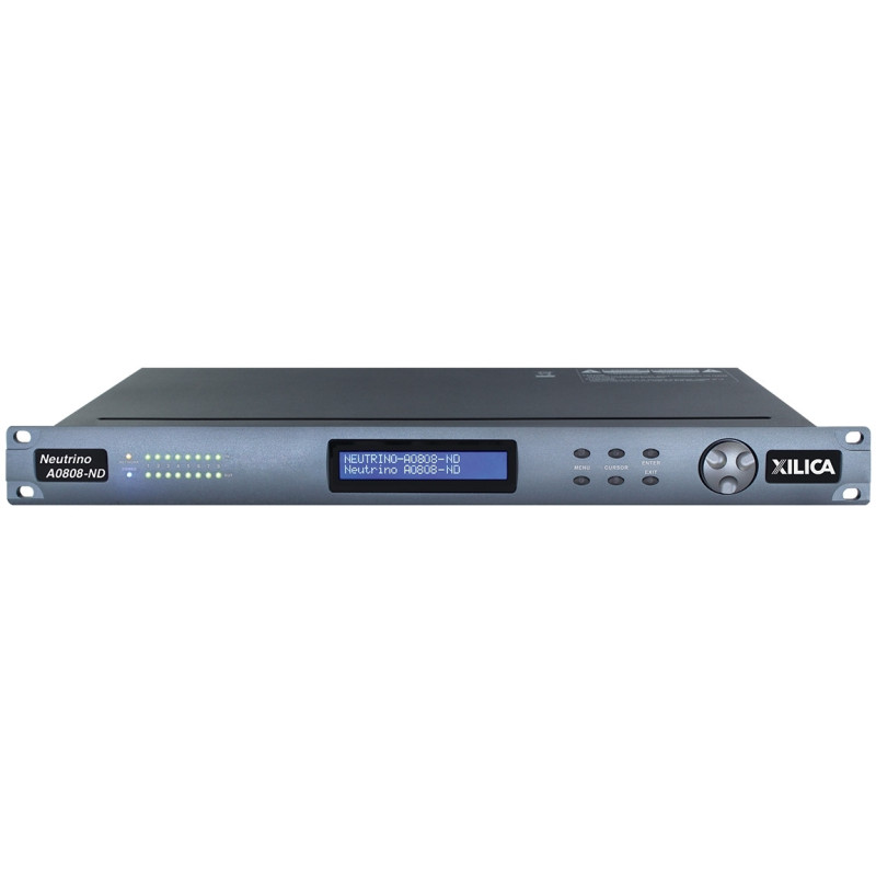 Xilica A0808-ND – DSP-аудиопроцессор серии Neutrino с открытой архитектурой и интерфейсом Dante (2хRJ45), 8 универсальных входов (Mic/Line) с включаемым фантомным питанием 48 В, 8 выходов, дополнительные 8x8 цифровых входов/выходов AES/EBU.