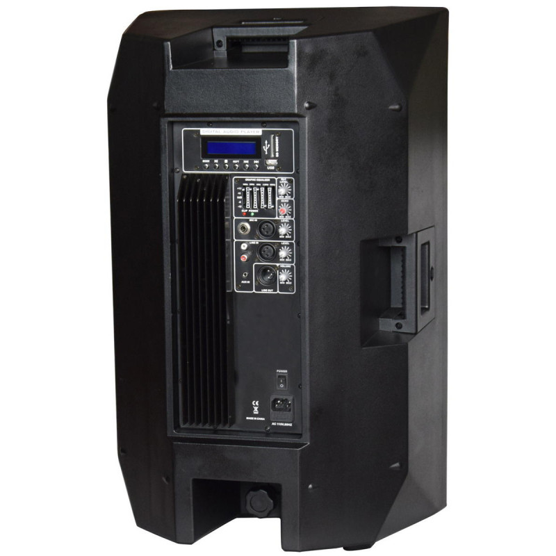 Модель имеет 15" НЧ-динамик, 3" VC и 1.75" титановый ВЧ-драйвер. Система оснащена надежным Bi-Amp усилителем класса Н мощностью RMS 300 Вт+ 50 Вт. Для подключения имеются входные разъемы 2 RCA, XLR, XLR/6.35mm jack Combo, а также вход 3.5 mm AUX. Модель оснащена USB/SD/Bluetooth/FM плеером и встроенным 5-полосным эквалайзером. Система может быть установлена на пол или смонтирована на стойку в стакан 35 мм. Также в комплект входит IR пульт.