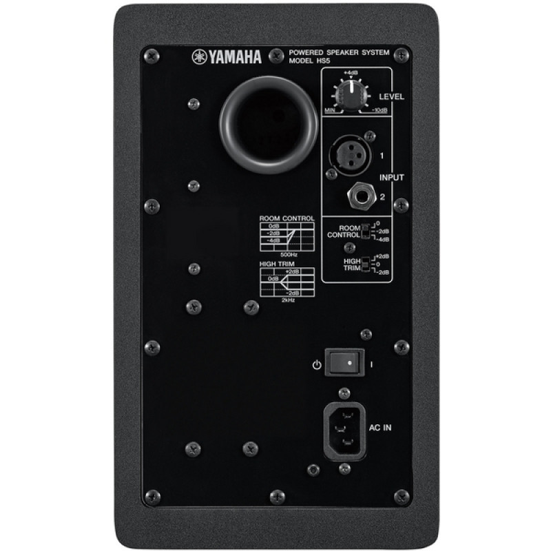 В корпусе Yamaha HS5 находится два усилителя мощностью 45 и 25 Вт. На тыльной поверхности кабинета находится два балансных входа: один XLR и один 1/4" TRS Jack. Там же можно найти регулятор громкости и два переключателя HIGH TRIM и ROOM CONTROL: первый управляет работой ВЧ-усилителей, уменьшая или увеличивая уровень сигнала на +/- 2 дБ, а второй переключатель подстраивает нижнечастотный диапазон (0/-2/-4 дБ), помогая избежать ненужных отражений. Переключатели рекомендуется использовать для подстройки в соответствии с конфигурацией помещения, а также рекомендуется использовать данные мониторы в связке с сабвуфером Yamaha HS8S.
