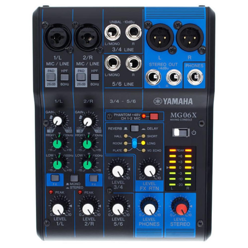 Yamaha MG06X – Это малошумящий студийный шестиканальный аналоговый микшер с микрофонными предусилителями D-PRE, которые позволяют использовать как динамические, так и конденсаторные микрофоны.