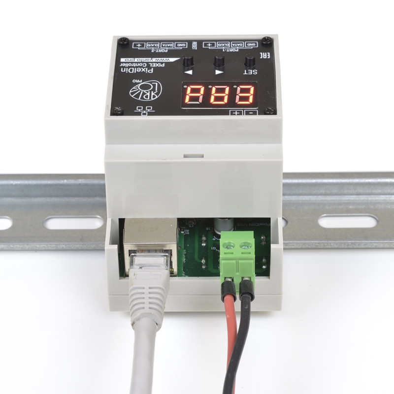 YARILO PIXEL DIN предназначен для управления светодиодными пиксельными лентами. Устройство подключается к локальной сети и получает данные по протоколу ArtNet, sACN*. К двум коннекторам могут быть подключены различные типы пиксельных лент (1-Wire SPI, 2-Wire SPI).