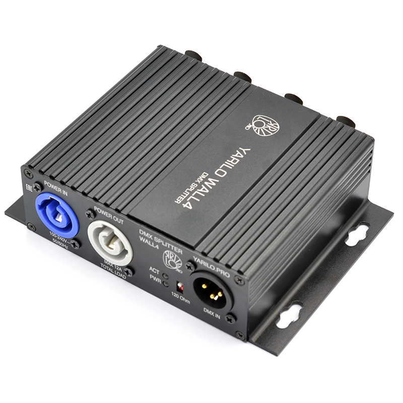 Питание сплиттера осуществляется напряжением 110-230В переменного тока через разъем powerCON. Имеется проходной разъем питания (максимальный ток 12А). Подключение DMX-кабеля осуществляется через разъемы XLR3. Светодиодные индикаторы показывают наличие напряжения питания (PWR) и входного сигнала (ACT). На входе предусмотрено подключение терминатора (120 Ом) с помощью DIP-переключателя. ЯRILO SPL WALL4 - идеальное решение для профессионального исполльзования, где требуется усиление и защиты сигнала DMX.