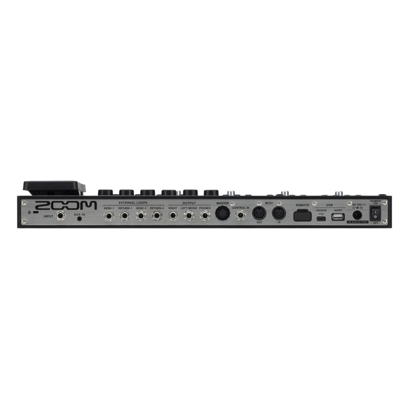 Порт USB Type-C позволяет подключить процессор к компьютеру и записывать аудио в формате 32 бит/44.1 кГц. Аудиоинтерфейс имеет 4 входа и 4 выхода. Порт USB Type-A предназначен для пользовательской флеш-карты. Для взаимодействия с внешним оборудованием в наличии есть MIDI-интерфейс с входом и выходом на стандартных коннекторах DIN. Питание осуществляется от комплектного адаптера Zoom AD-19 на 12 V DC. Опционально можно приобрести Bluetooth-адаптер BTA-1, который дает возможность беспроводного управления с помощью приложения Zoom Guitar Lab для платформы iOS.