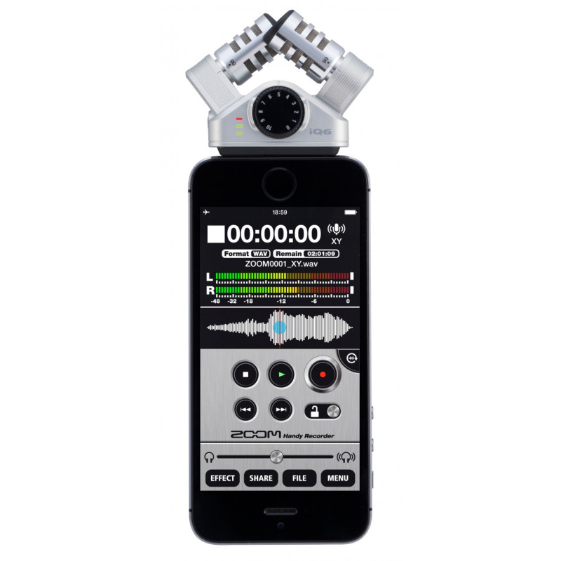 Приложение Zoom Handy Recorder, которое доступно для скачивания из App Store, добавит богатый набор возможностей вашему iQ6 и iOS-устройству. Вдобавок к управлению уровнями на экране устройства, оно позволит вам регулировать громкость наушников, подключенных к вашему iQ6, а также применять автоматические наборы настроек, которые будут полезны при записи встреч, речей, интервью и других подобных ситуаций, когда вам нельзя упустить ни слова. Выбирайте формат PCM для записи в наивысшем качестве или формат AAC, если вам важна экономия свободного места. Кроме того, вы можете применять компрессию, настраивать эквалайзер и эффекты реверберации. Данное приложение даже позволит вам отправить получившиеся записи по электронной почте или загрузить их на музыкальный сервис SoundCloud.