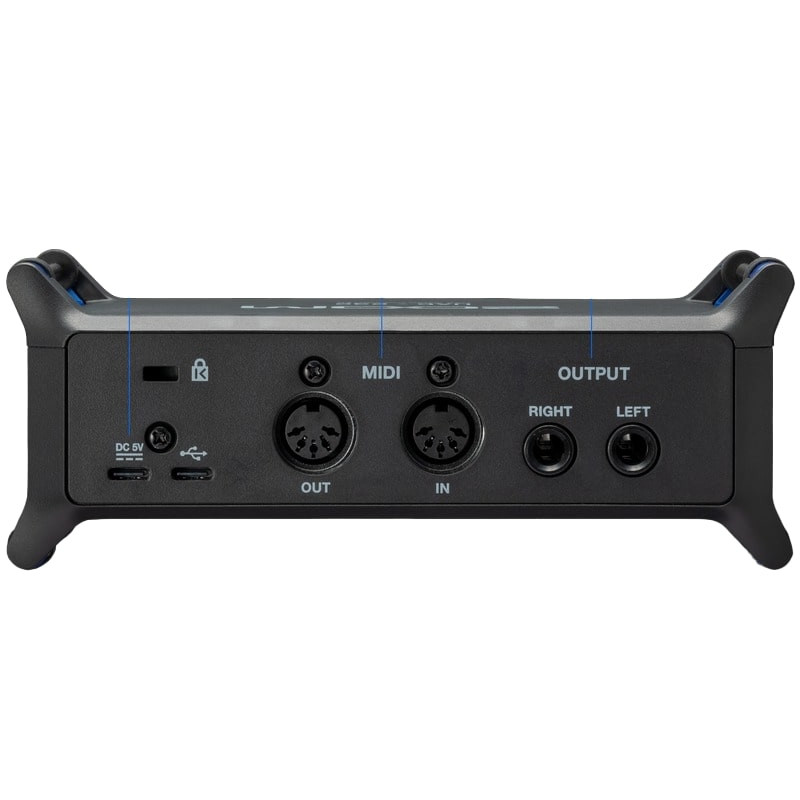Кроме выходов линейного уровня, интерфейс оборудован разъемами MIDI для работы с внешними синтезаторами. Два порта USB-C позволяют работать в ситуациях, когда хост-устройство не дает достаточного питания — например при использовании планшета.
