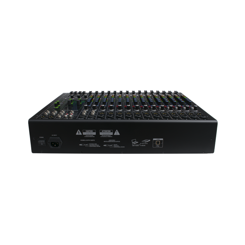 - Входы: 8 линейный/микрофонный (XLR/Jack), 2 микрофонных (XLR), 1 линейный (mini-Jack), 3 стереопары (2 Jack, 1 RCA), 2 возврата (Jack), 2 AUX (Jack), 1 USB, питание AC Input