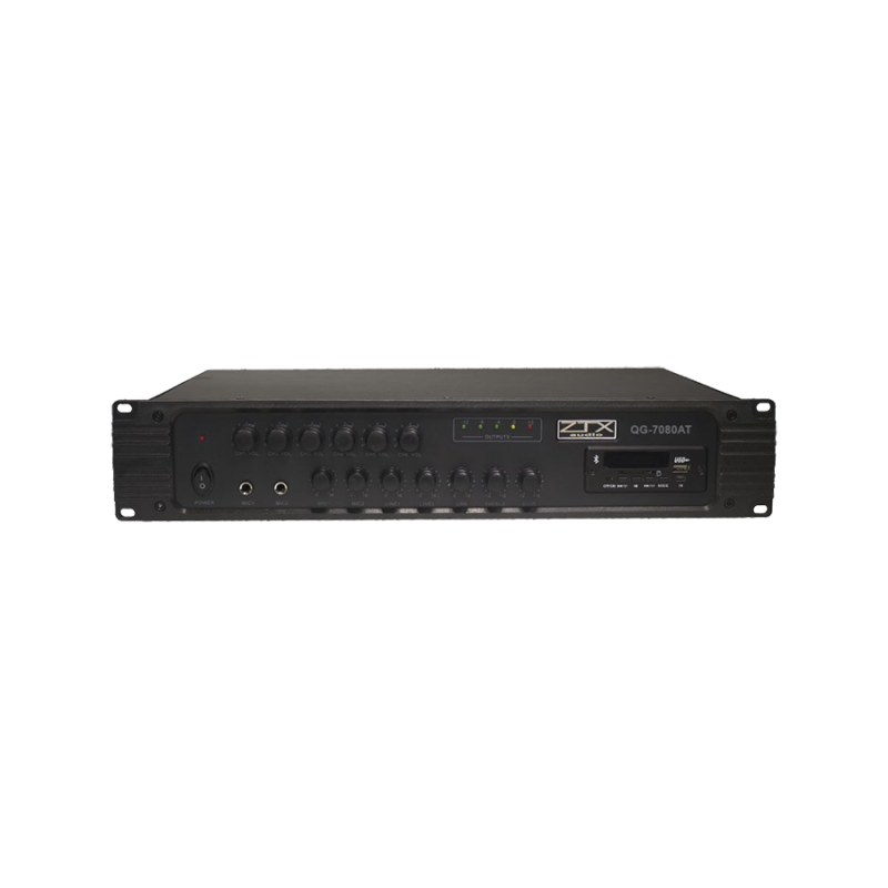 ZTX audio QG-7080AT - это профессиональный трансляционный микшер-усилитель, предназначенный как для фонового озвучивания помещения,так и для систем оповещения.